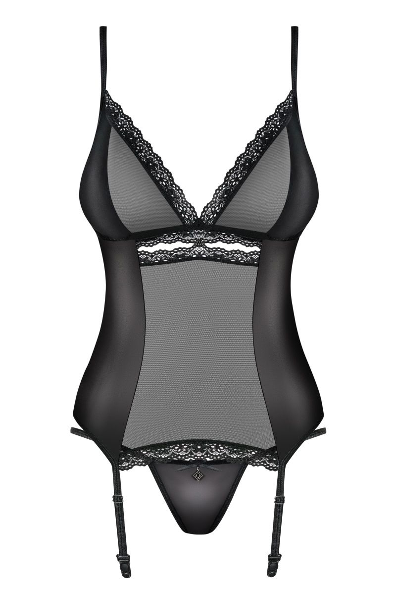 Эротический корсаж цвета выполнен из прозрачной сеточки и атласной ткани, декорирован кружевной окантовкой, бретели регулируются. В комплекте: корсаж и трусики-стринги.
