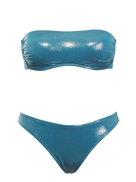 Раздельный купальник: бюстгальтер-бандо с мягкой чашкой без косточек со съемными формованными вкладышами (без пуш-ап) и трусики-бразильяна, высота бочка 3 см. Бочок усилен костью. Отстегивающаяся бретель через шею. Застежка- завязка на спинке. Выполнен из тонкой микрофибры с золотистым напылением. В комплекте: лиф, трусики.