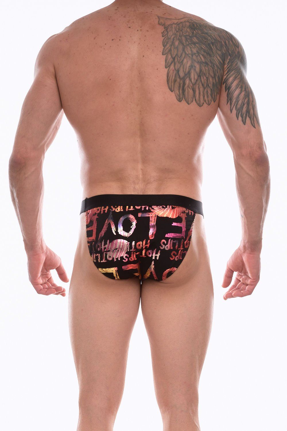 Черные мужские трусы-танга с блестящим принтом.