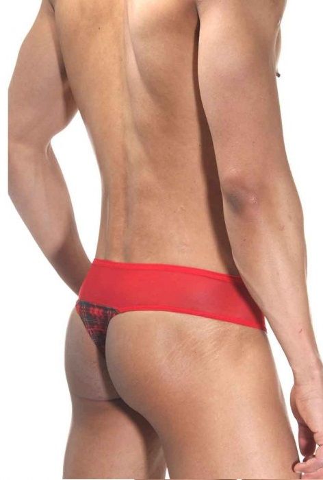 Мужские трусы-тонги, верх у которых сделан из тонкой полупрозрачной ткани, а низ из более плотной ткани в клетку.