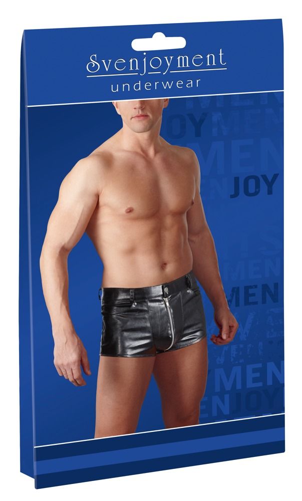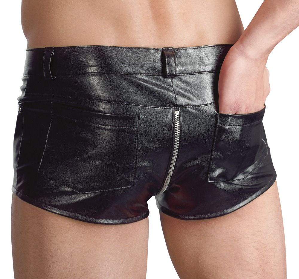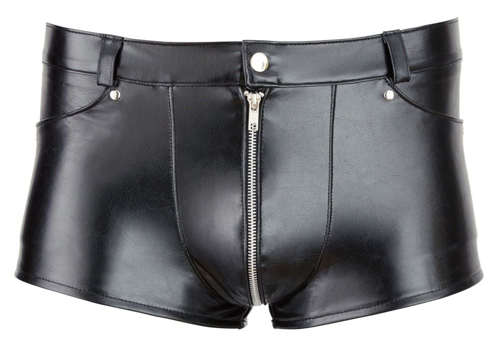 Трусы-шорты с молнией в промежности. Выполнены из материала, напоминающего кожу.