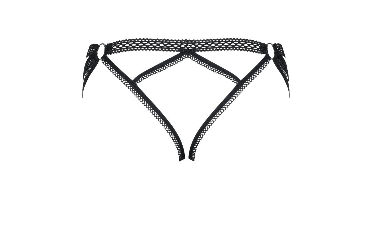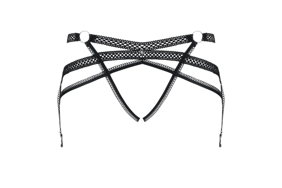 Эффектный пояс для чулок Darkie выполнен из эластичных лент и декоративных колечек. Подвязки для чулок регулируются.