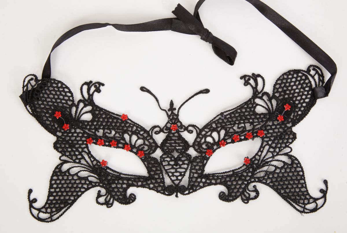Кружевная маска в венецианском стиле в форме бабочки, украшена красными бусинками. Завязывается на атласные ленты. Упаковка - бумажный пакет. Размеры - 26 х 12 см.