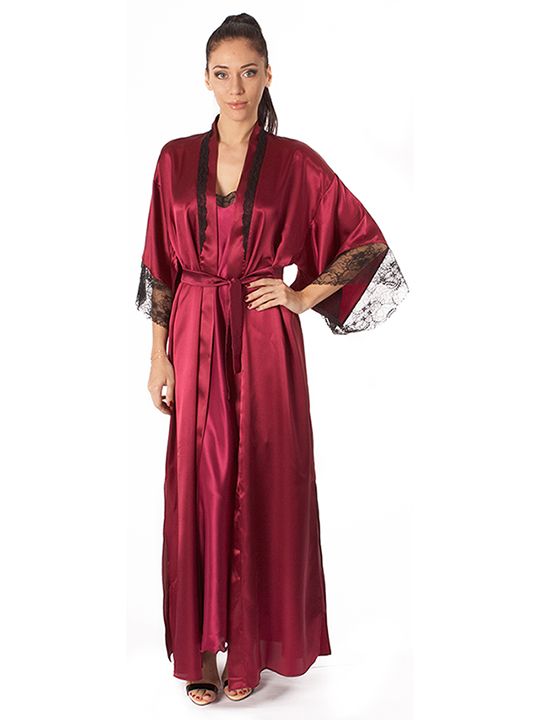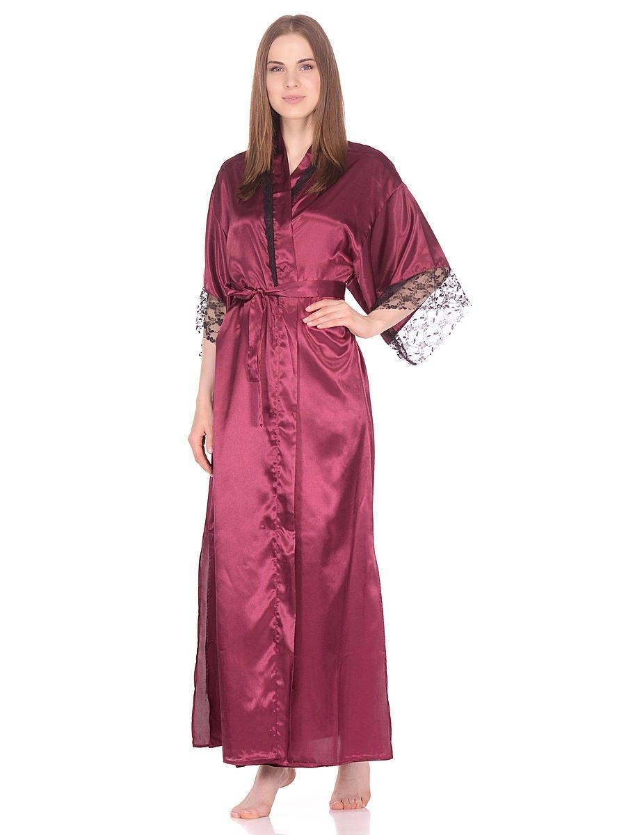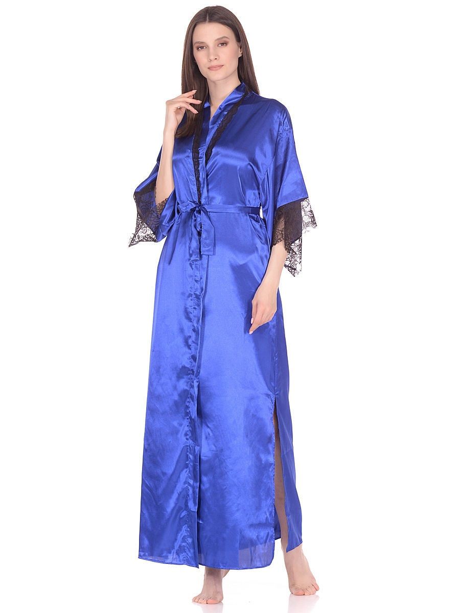 Роскошный длинный халат из искусственного однотонного шелка, прямого силуэта, с запахом под пояс. Рукава широкие, длиной три четверти, с удлинённой проймой, по низу отделаны изысканным ажурным кружевом с фестонами. Спинка со сборкой по талии с притачным поясом. По бокам высокие разрезы. Линия горловины декорирована узким кружевом. Соответствие размеров: F - 42-50.