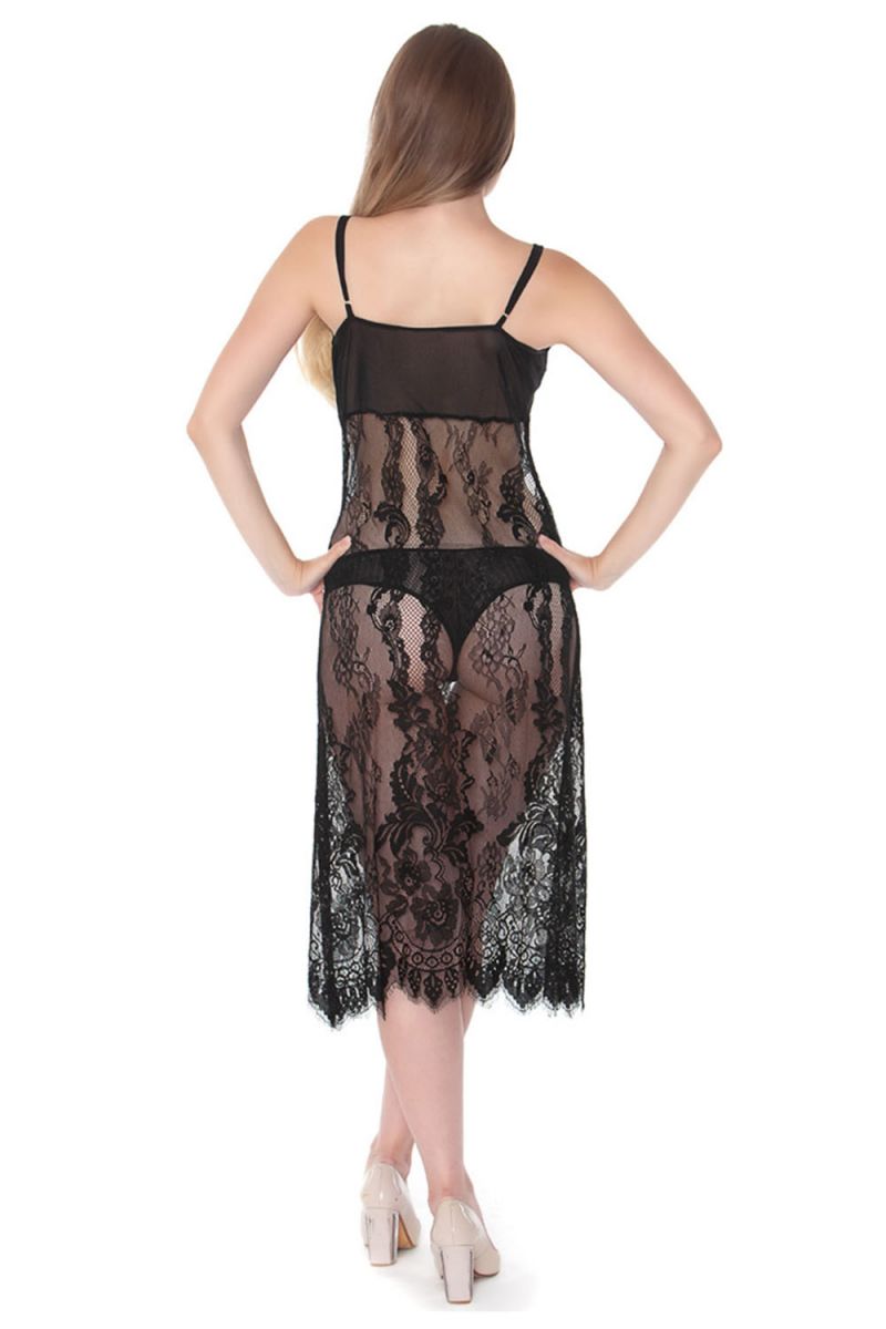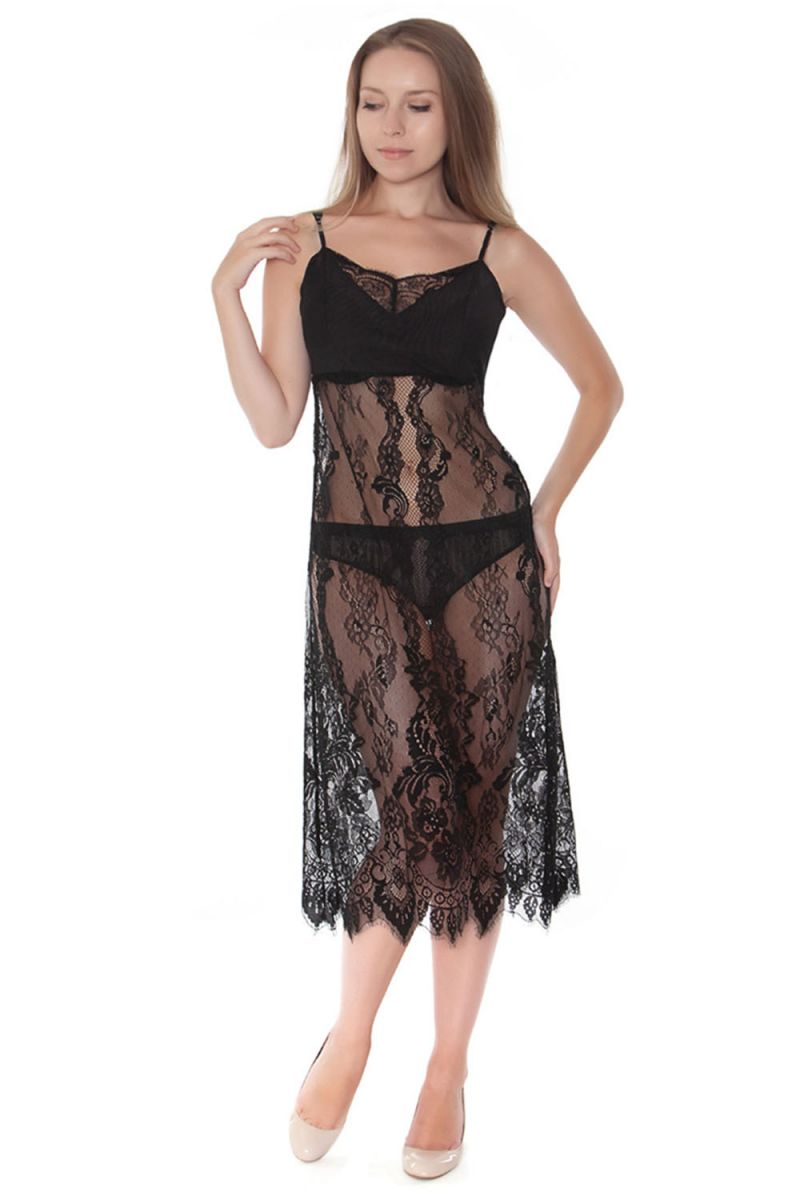 Женская сорочка выполнено из кружевного полотна. Модель полуприталенного силуэта длиной ниже колена. Лиф на тонких бретельках с подкладом из сетки и украшен кружевом по линии декольте. Трусики не входят в комплект!