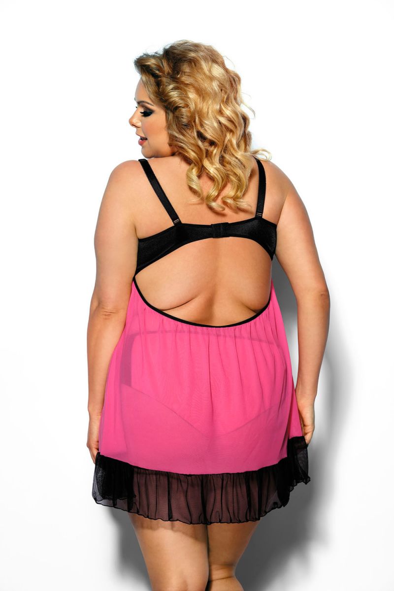 Полупрозрачная розовая сорочка с контрастными черными вставками, чашка мягкая без косточки, бретели регулируются по длине, застежка крючки. В комплект входят трусики в тон изделия. В комплекте: сорочка, трусики.