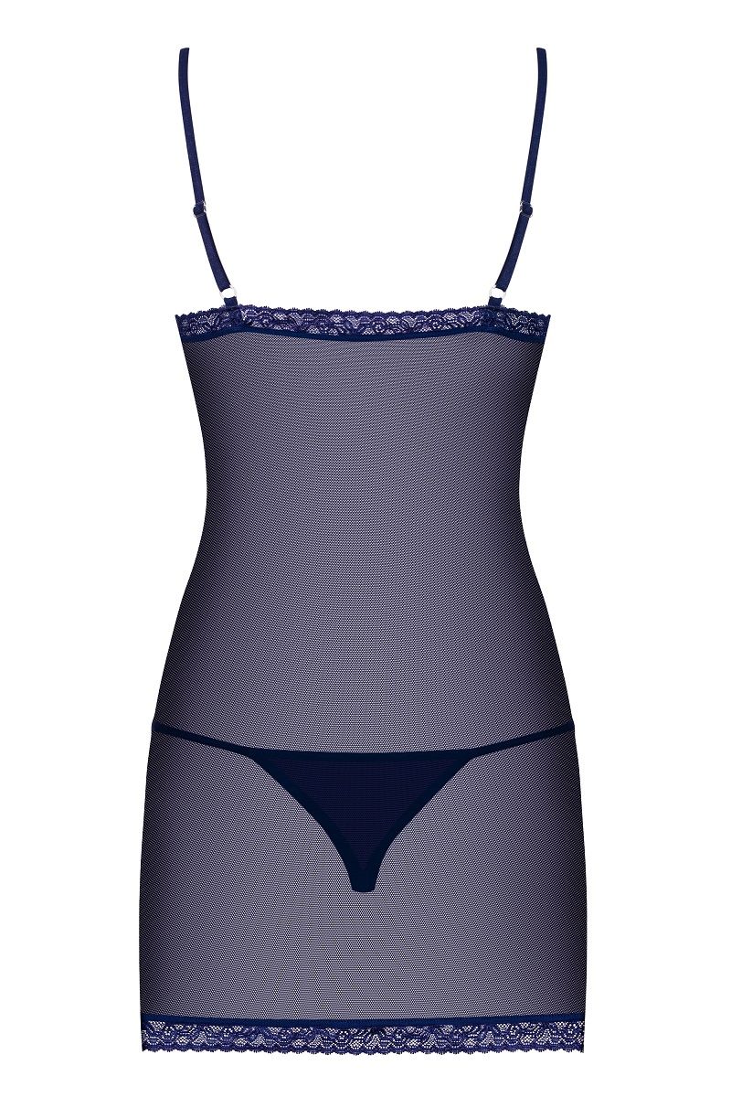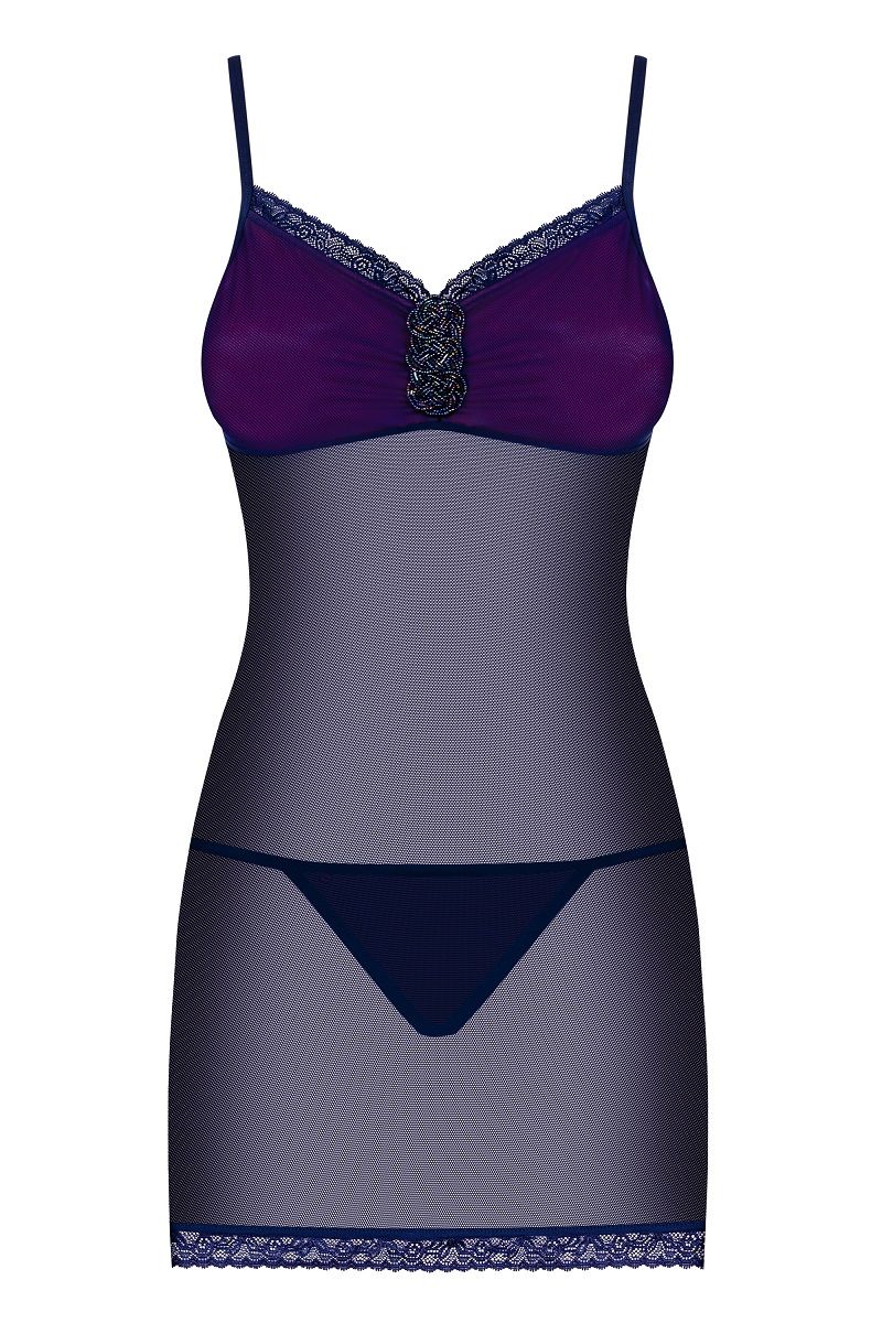 Фиолетовая полупрозрачная сорочка Suella с нежным кружевом и украшением на лифе. В комплекте: сорочка, трусики-стринги.