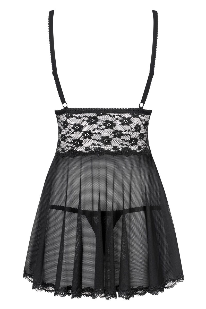 Эротичная сорочка в стиле бэби-долл из прозрачной вуали. Зона декольте изготовлена из кружева с цветочным узором. Чашечки на косточках с тонким поролоном снизу приподнимают грудь. Между ними украшение в виде атласного бантика и сверкающей подвески. Бретели сорочки регулируются по длине. Расклешенный подол декорирован кружевной оборкой. В комплекте: сорочка и трусики-стринги.