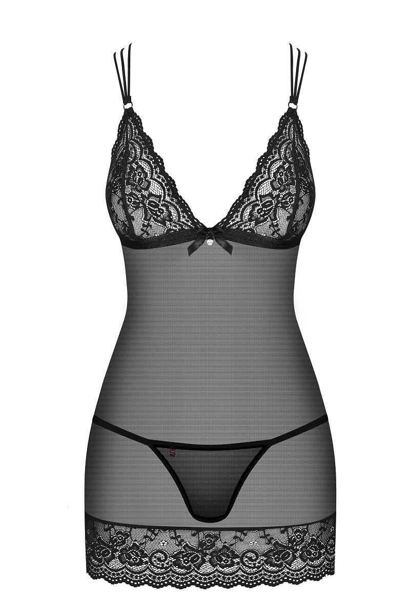 Облегающая сорочка с перекрёстными бретелями на спинке. В комплекте: сорочка, трусики-стринги.