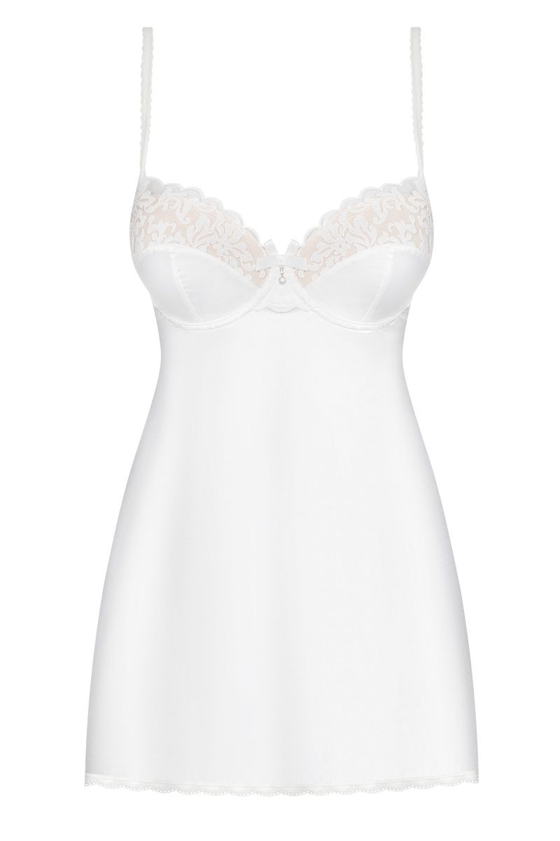 Сорочка с регулируемыми бретелями, на спинке застежка, выполнена из атласной ткани, лиф декорирован очаровательной вышивкой. В комплекте: сорочка и трусики-стринги.