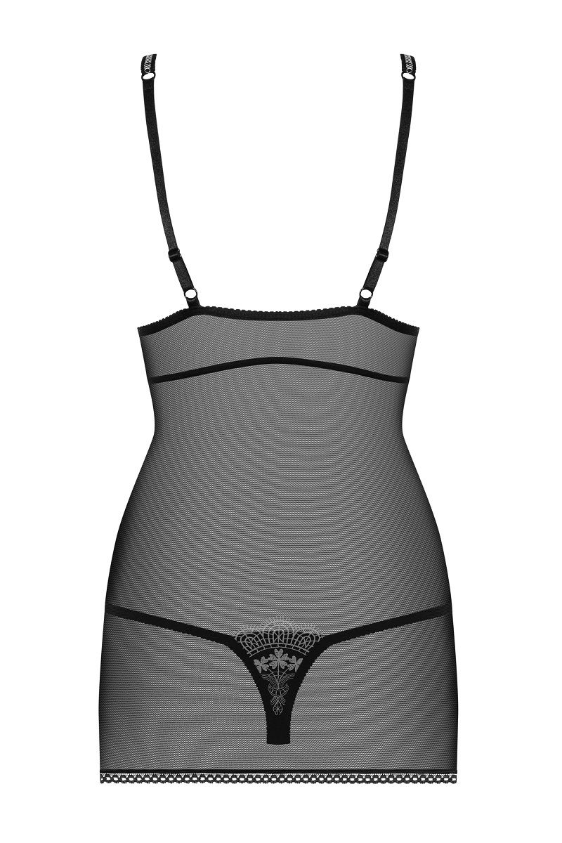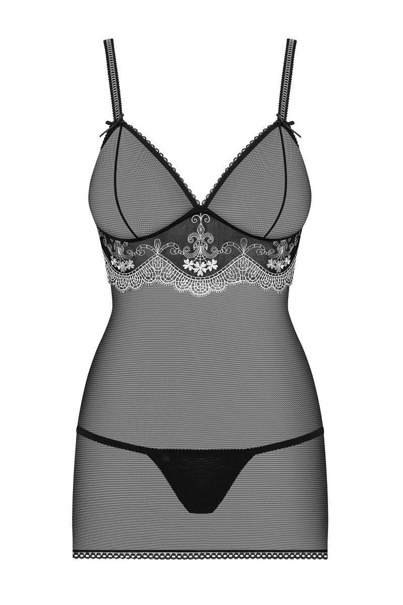 Полупрозрачная сорочка с ажурным декором под лифом. В комплекте: сорочка, трусики-стринги.