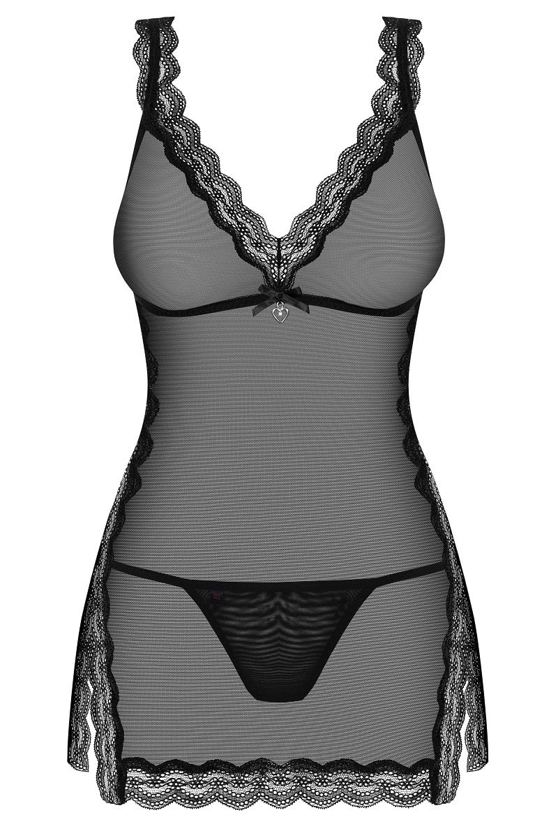 Полупрозрачная сорочка с небольшими разрезами по бокам. В комплекте: сорочка, трусики-стринги.