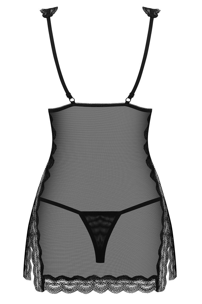 Полупрозрачная сорочка с небольшими разрезами по бокам. В комплекте: сорочка, трусики-стринги.