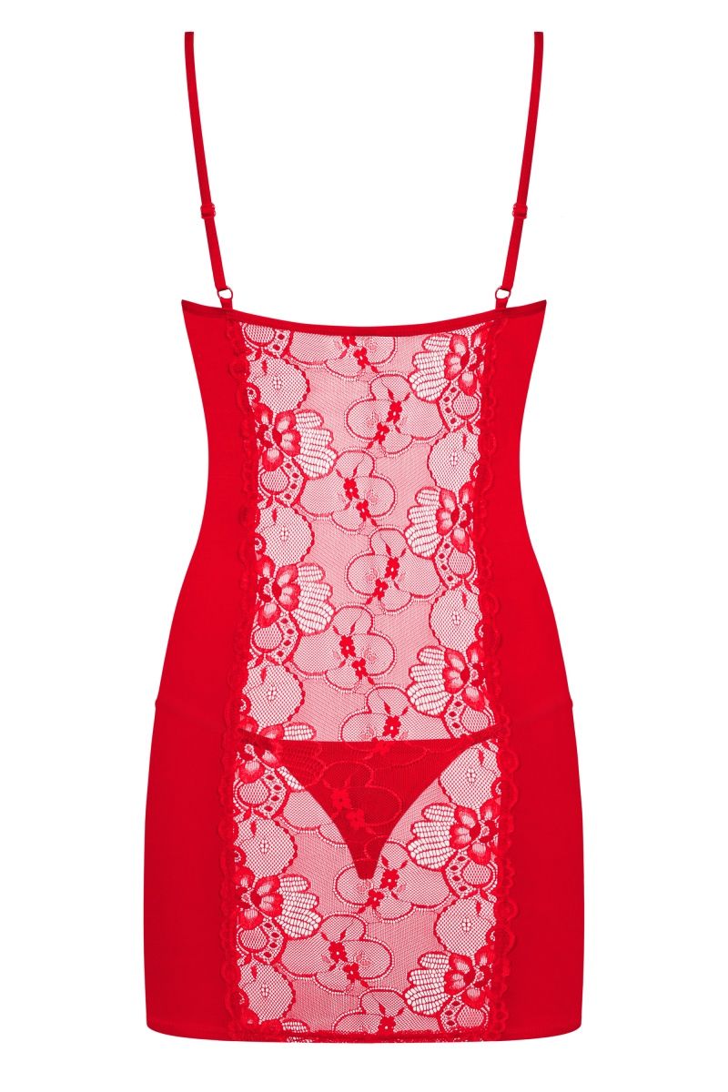 Соблазнительная сорочка из стрейч-атласного материала и кружева, в зоне декольте сорочка украшена подвеской со стразами в форме сердечка. Чашка мягкая на косточке. В комплект входят трусики стринги. В комплекте: сорочка и трусики-стринги.