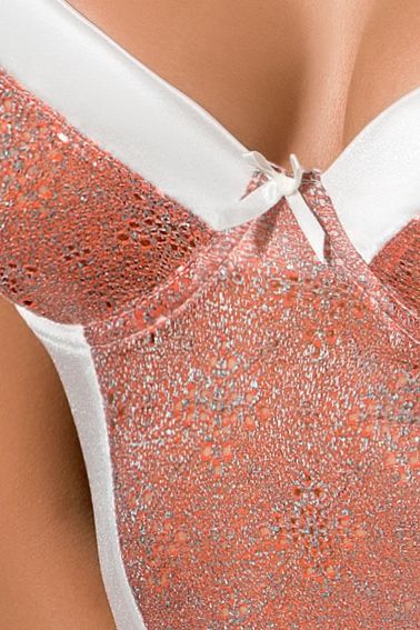 Любимый не сможет отвести от вас глаз, если сегодня вы решите надеть эту очаровательную сорочку с комбинированным непрозрачным лифом на косточках. Облегая стан подобно второй коже, наряд покажет изгибы фигурки во всей их красе. Вставка из персикового кружева визуально вытянет силуэт. Спинка останется почти полностью открытой, если не считать небольшой застёжки. В комплекте: сорочка, трусики-стринг.