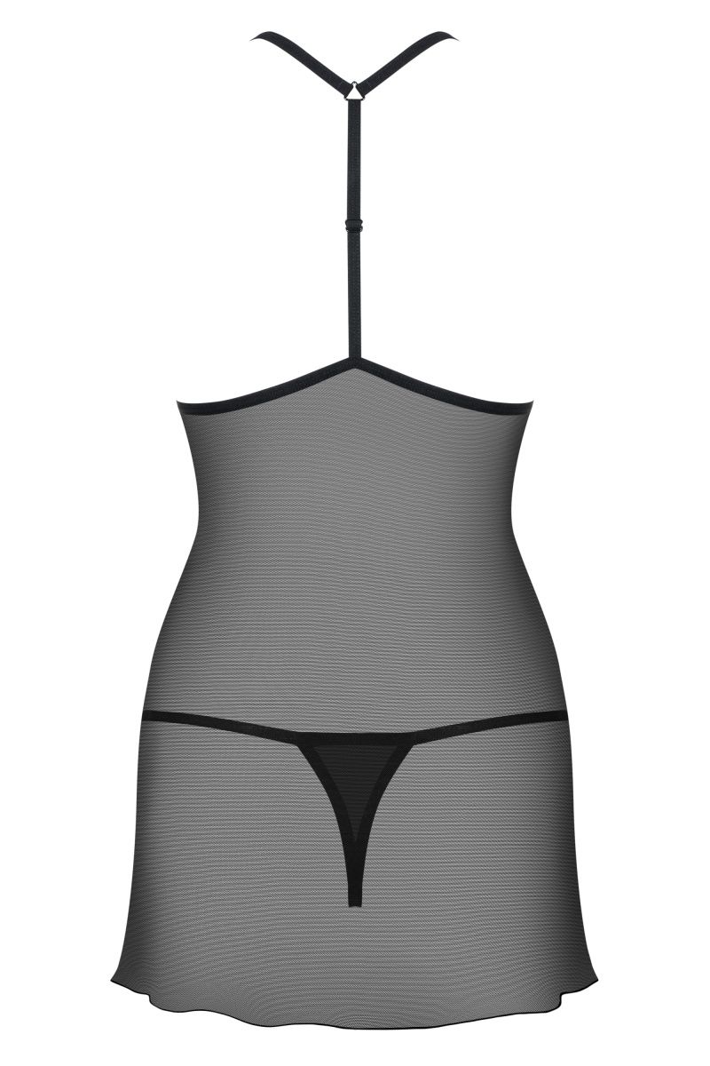 Полупрозрачная сорочка и стринги. Лиф сорочки декорирован мягкими стреп-лентами, эластичные бретели соединяются сзади за шеей. В комплекте: сорочка и трусики-стринги.