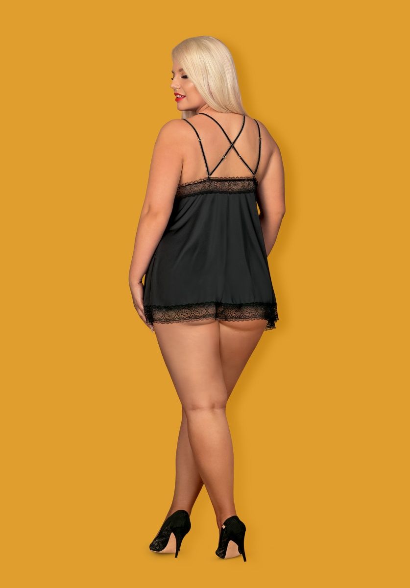 Элегантная женская сорочка в стиле бэби долл черного цвета. Формованные чашечки выгодно подчеркивают грудь. Тонкие регулируемые бретели изготовлены из бархатистой ткани и красиво перекрещиваются на спине. Места соединения бретелей с сорочкой дополнены золотистыми украшениями. Под грудью и на подоле нежные кружевные вставки. Трусики стринги включены в комплект. В комплекте: сорочка и трусики-стринги.