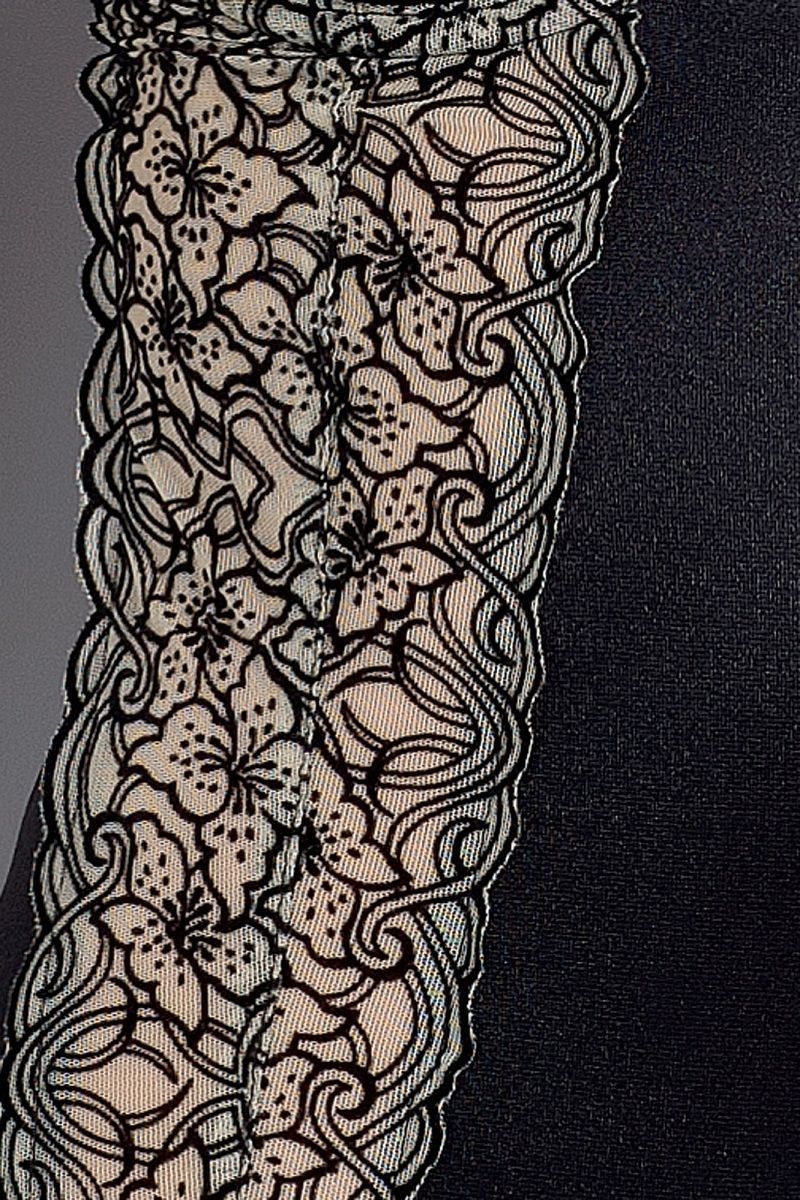 Сорочка с открытой спиной из стрейч-атласного материла, чашка мягкая на косточке, застежка на крючках. Спереди сорочка украшена цветочным принтом, шов на спине декорирован атласными бантиками. Спереди и сзади у сорочки небольшие разрезы снизу. В комплекте: сорочка, трусики-стринги.