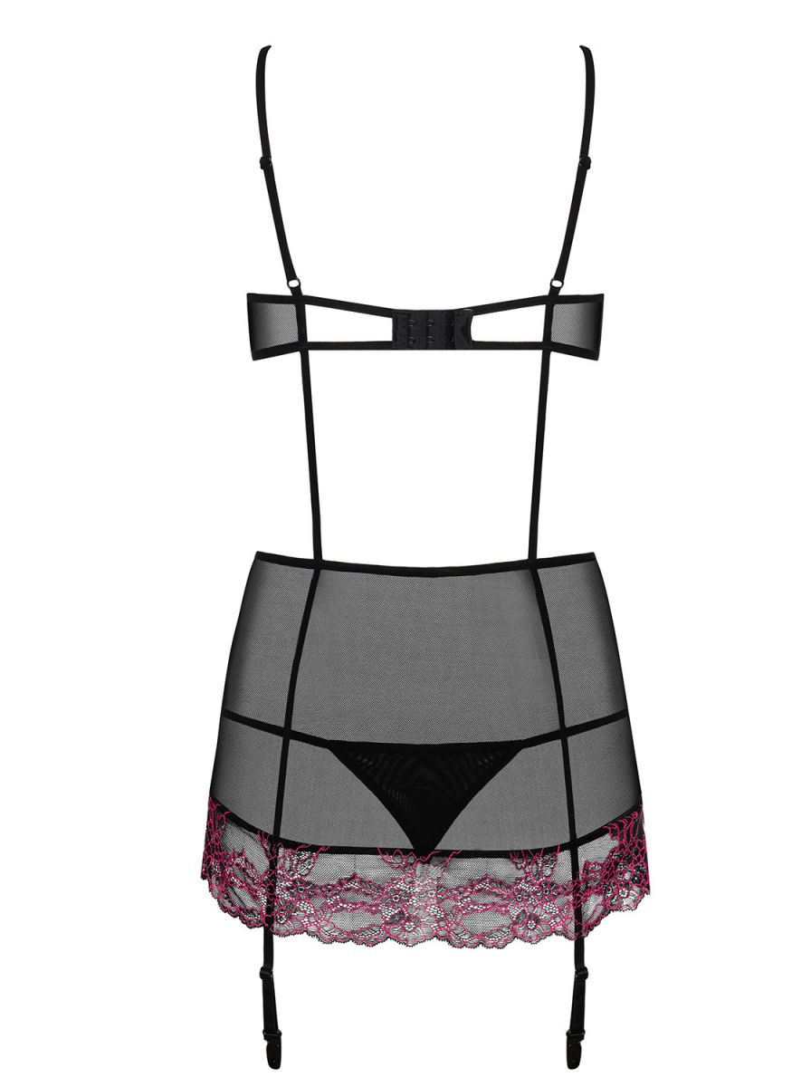 Сорочка и трусики из полупрозрачного материала, зона декольте и низ украшены кружевом. Спина открытая. Застежка на двух крючках. Пажи для чулок регулируются по длине. В комплекте: сорочка, трусики-стринги.