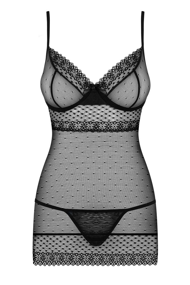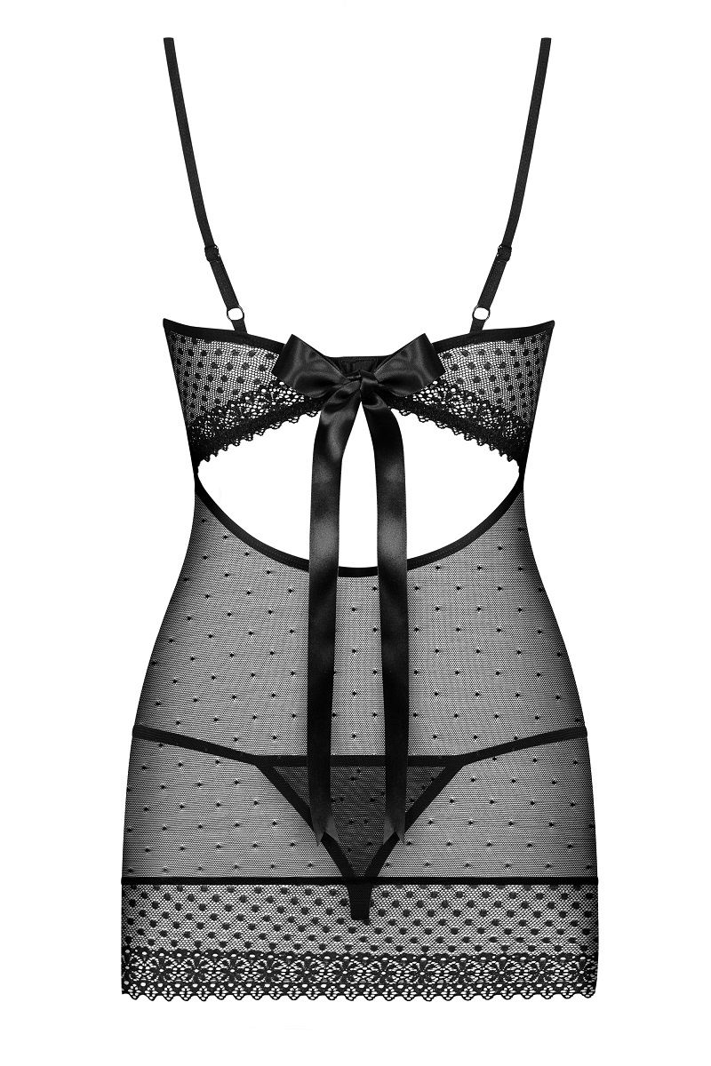 Полупрозрачная сорочка на тонких бретелях, идеально облегает фигуру, чашка мягкая на косточке, сзади сорочка украшает атласный бант, в комплект входят трусики. В комплекте: сорочка, трусики-стринги.