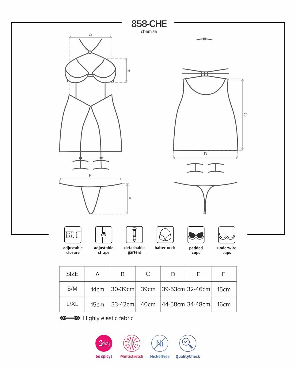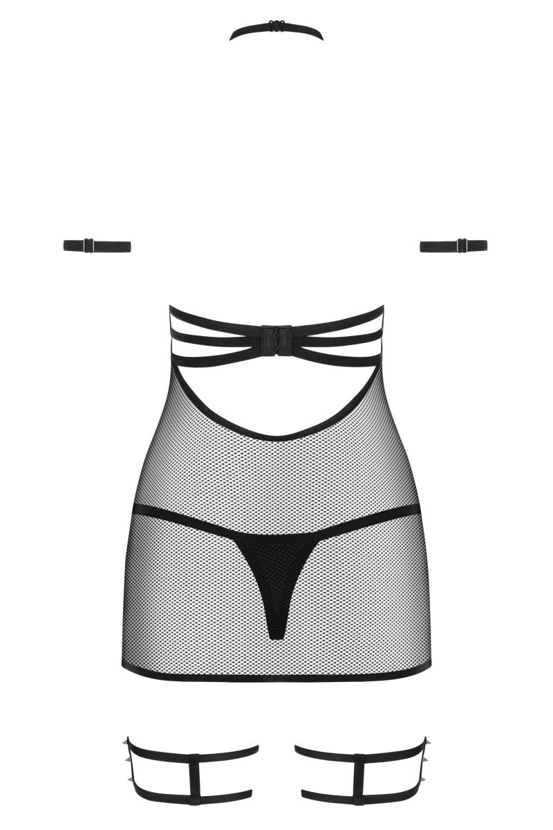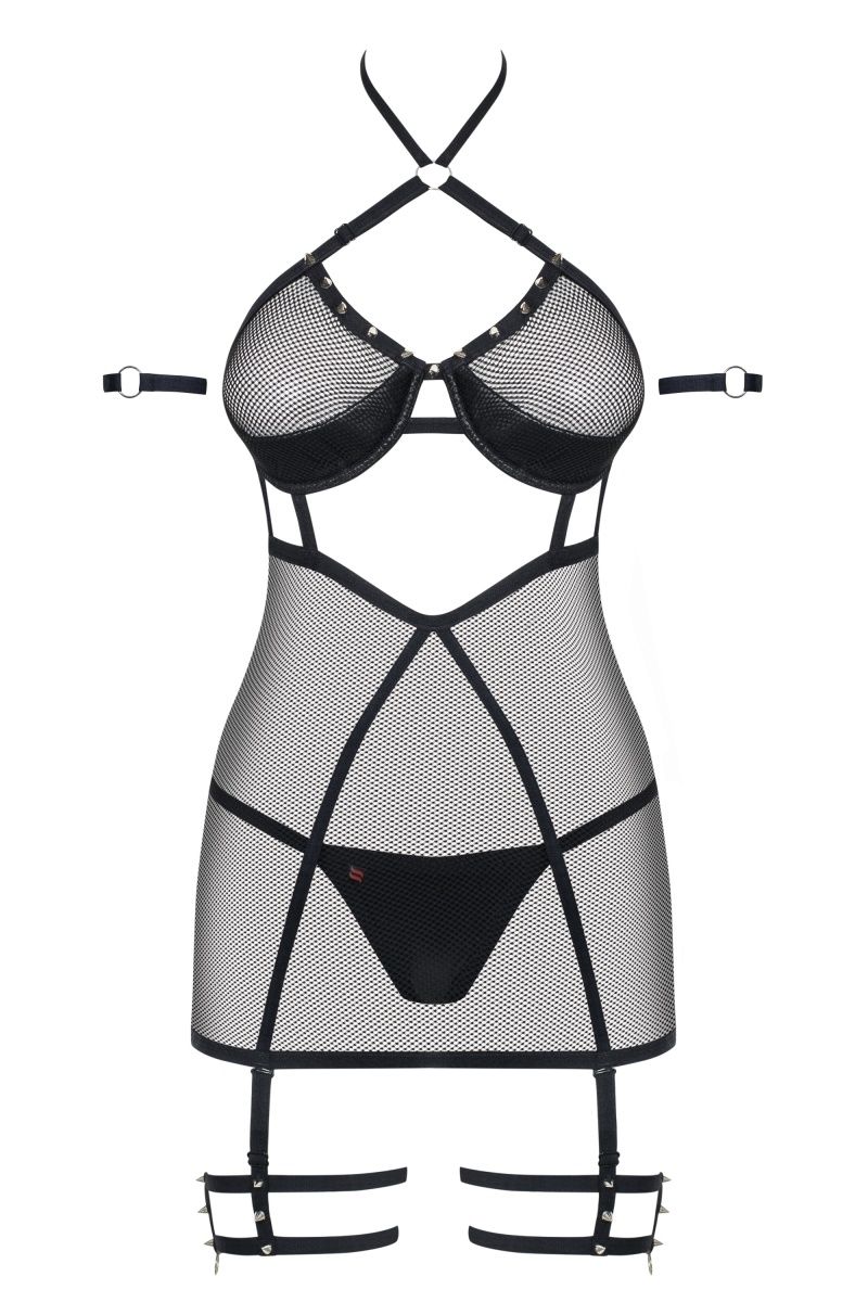 Сексуальная сорочка выполнена из полупрозрачной сеточки и эластичных лент. В комплекте: сорочка, трусики-стринги, подвязки и браслеты на руки.
