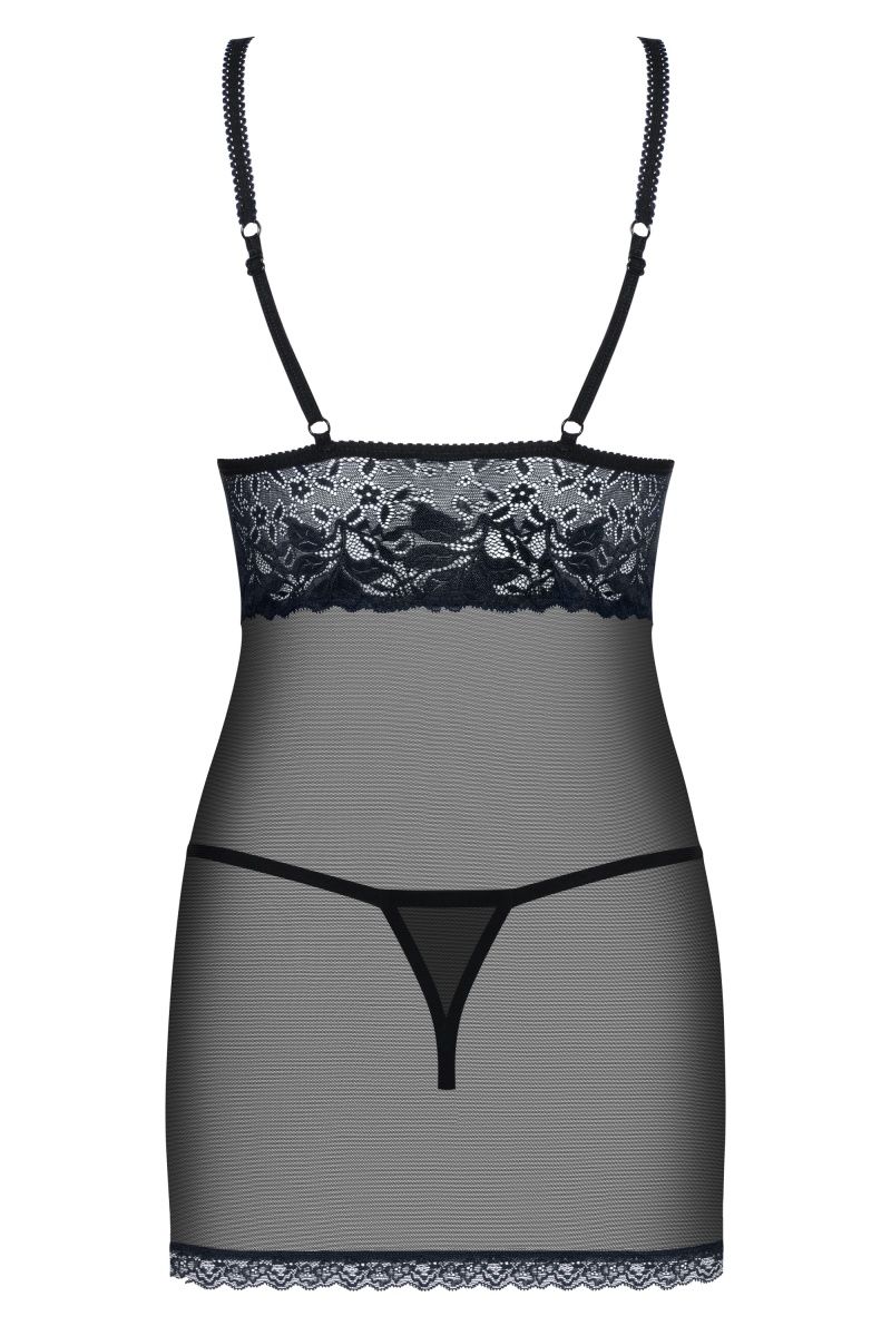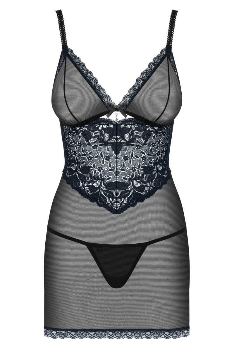 Прозрачная сорочка. Под грудью сорочка декорирована вставкой из темно-синего кружева, бретели регулируются. В комплекте: сорочка и трусики-стринги.