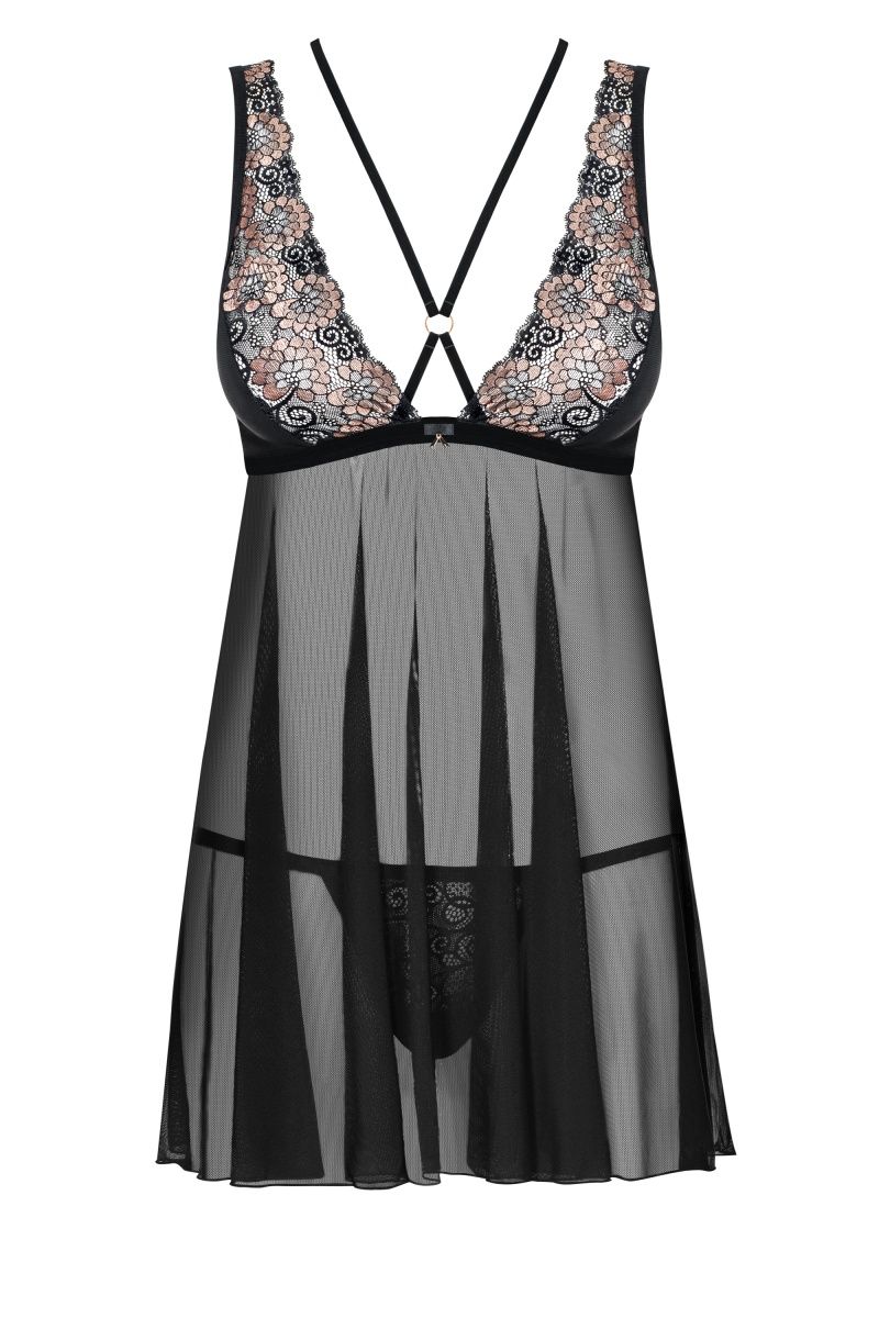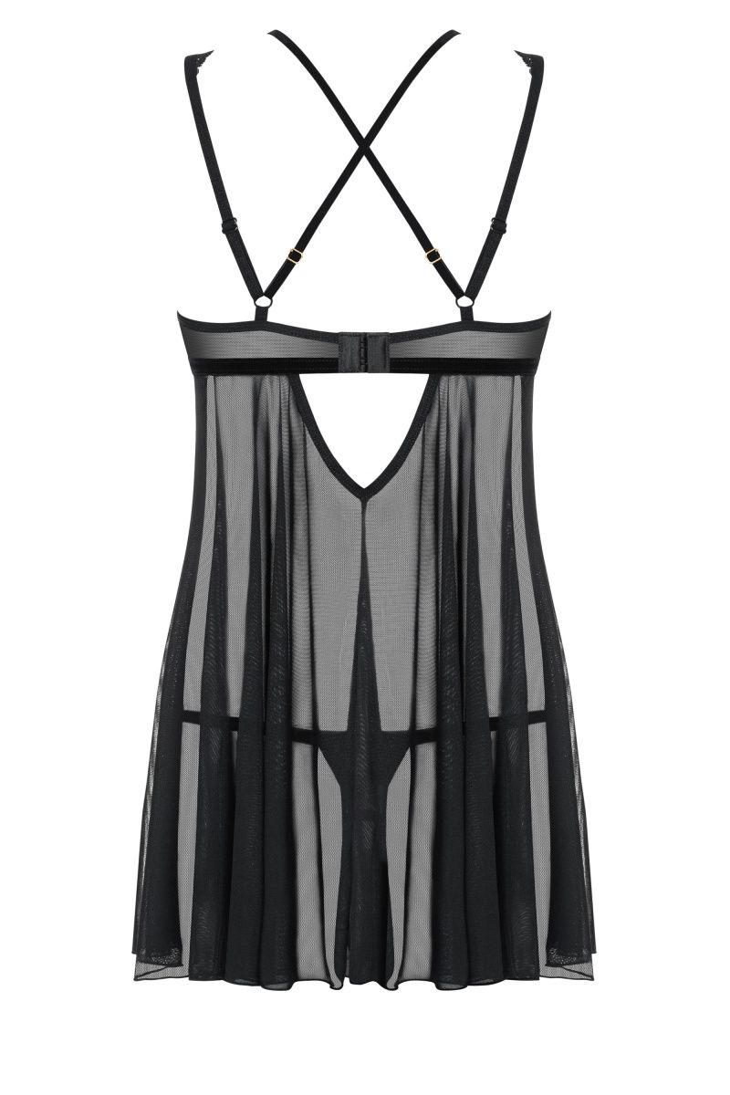 Обольстительная сорочка выполнена из полупрозрачной сеточки. Лиф сорочки украшен цветочным кружевом и бархатными лентами. Бретели регулируются по длине, на спинке застежка. В комплекте: сорочка и трусики-стринги.