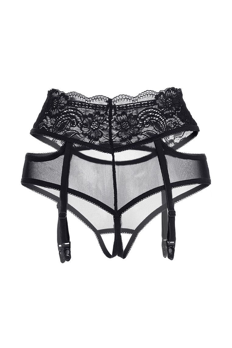Трусики-пояс для чулок из эластичной сетки со вставками кружева, с декоративными вырезами. Имитация пояса со свободным ажурным краем. Высокая посадка. Регулируемые пажи. Допускается замена кружева на аналогичное.
