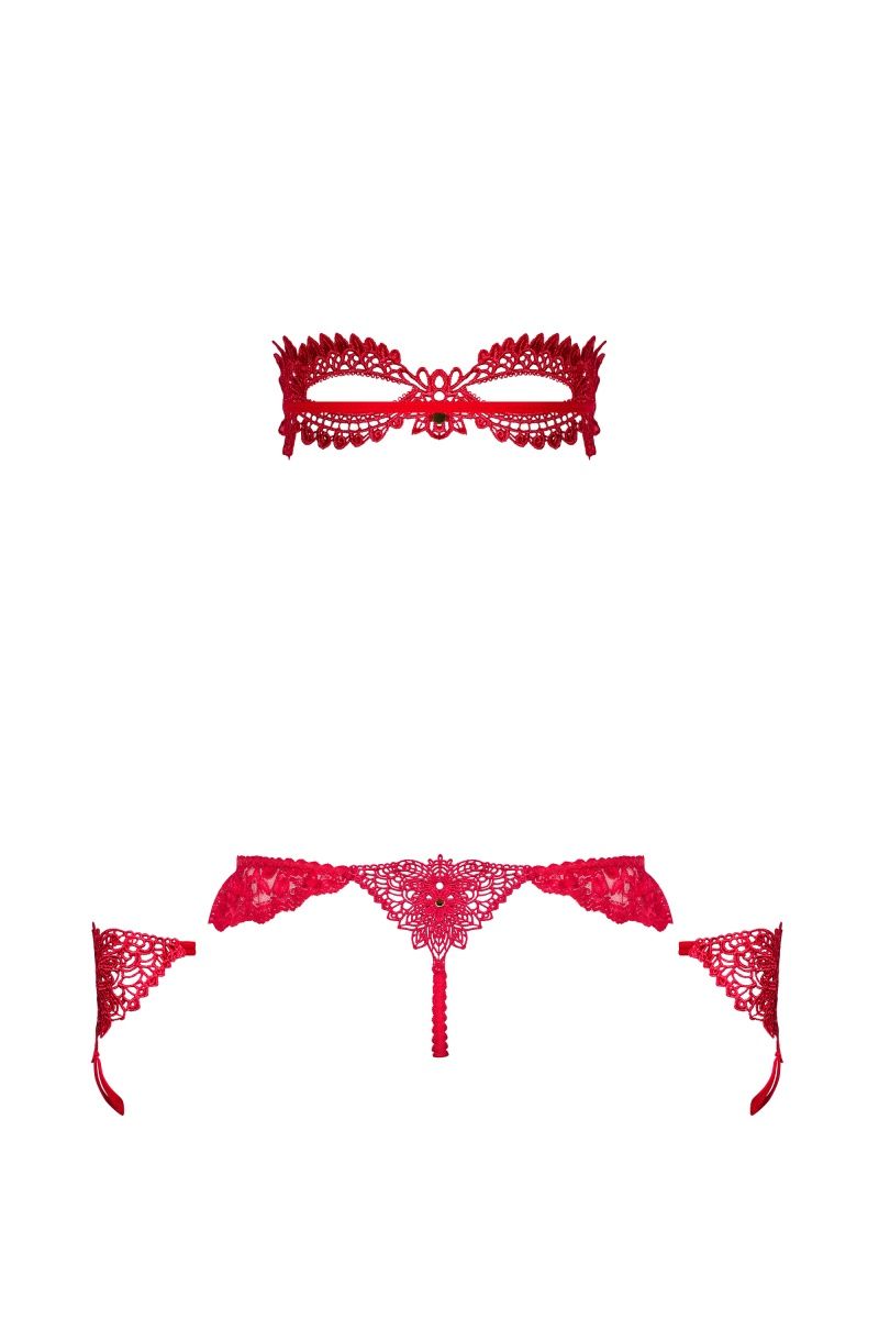 Соблазнительный комплект Hetea выполнен из ажурного кружева красного цвета. В комплект входят стринги с доступом, маска и митенки. В комплекте: трусики-стринги, маска, митенки.