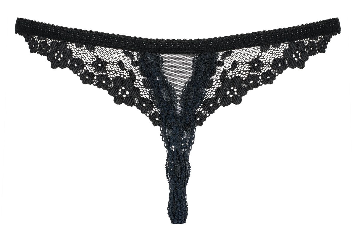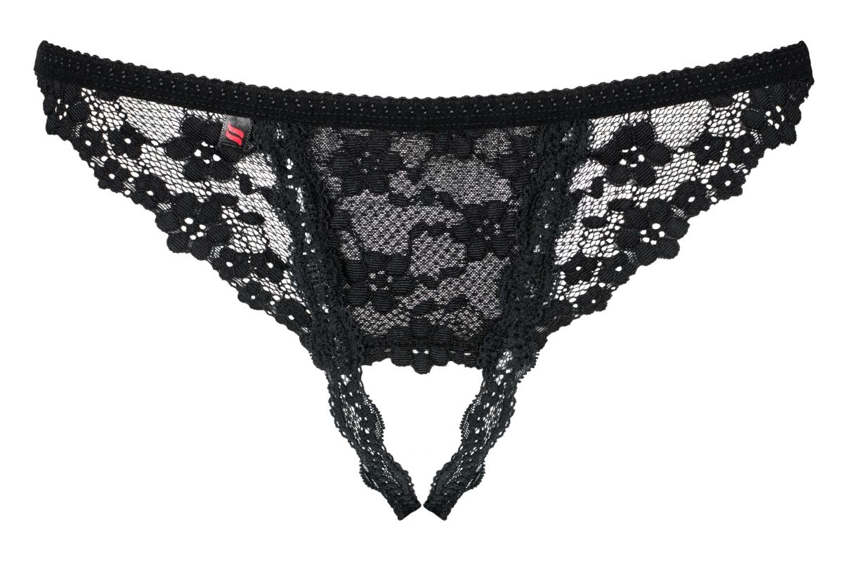 Откровенные трусики-стринги с открытой промежностью. Изготовлены из кружевной ткани с цветочным узором.