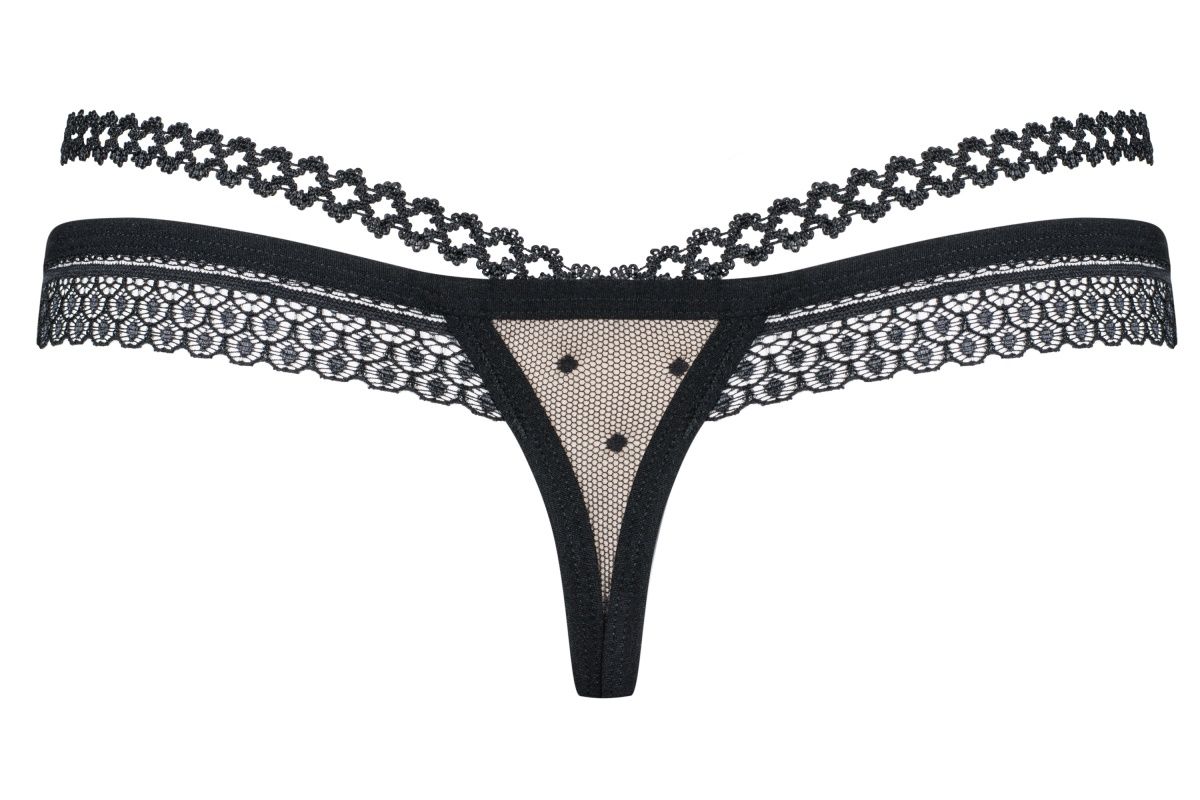 Женские стринги выполнены из сеточки и кружева.