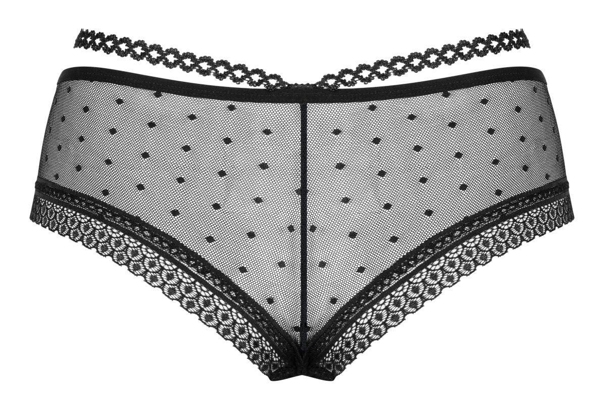 Шортики выполнены из полупрозрачной сетки в горошек. Декорированы кружевом и стреп-лентами.