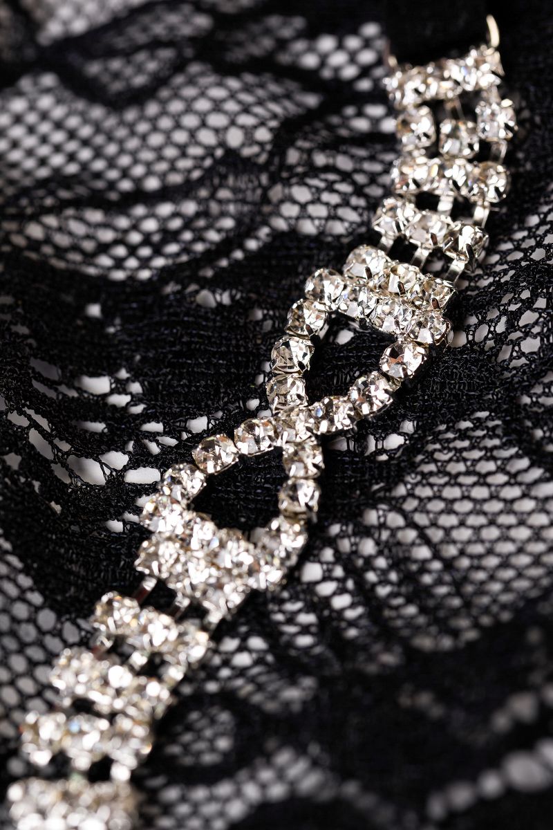 Цветочный орнамент из роскошного кружева спереди. Сзади расположился изящный бант, выполненный из блестящих страз. Особой сексуальности образу придают лямки, уходящие вдоль ягодиц.