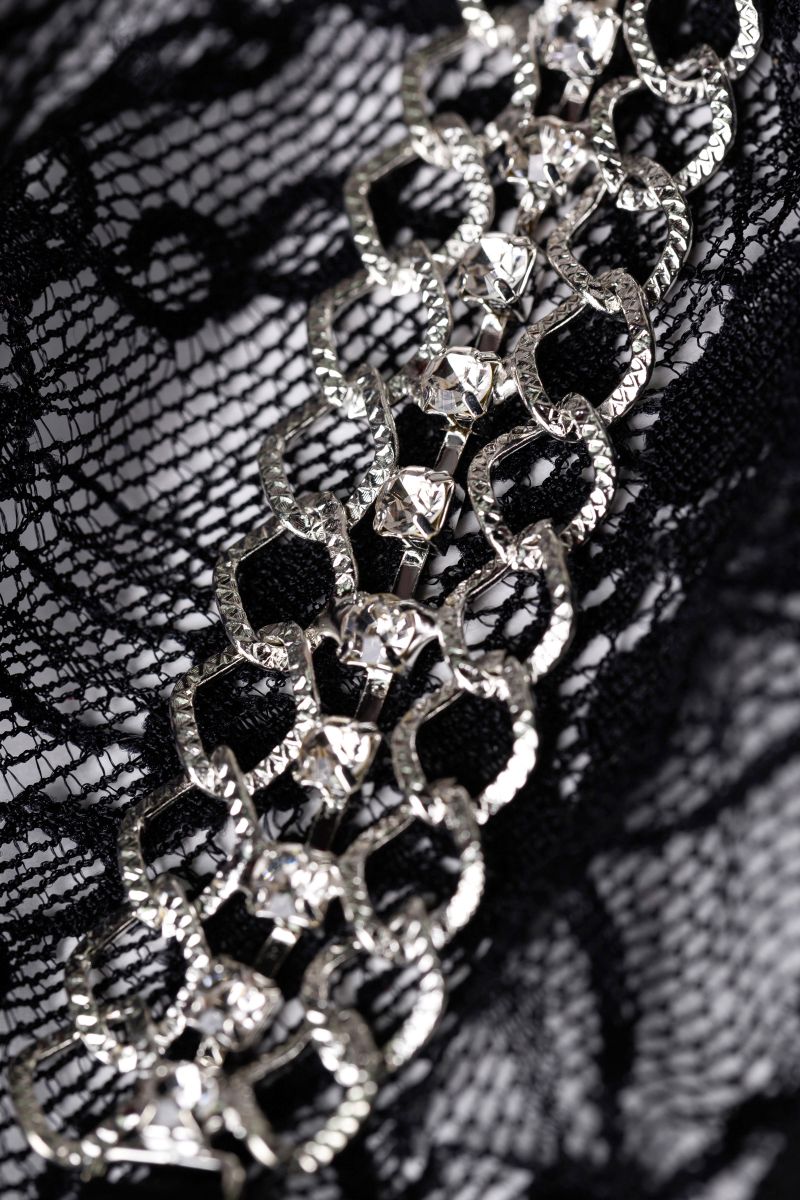 Цветочные орнаменты плавно переходят в цепочку из страз, украшенную белыми декоративными камнями. Загадочные и сексуальные впереди и классически сзади, эти трусики - украшение самой интимной части вашего тела.