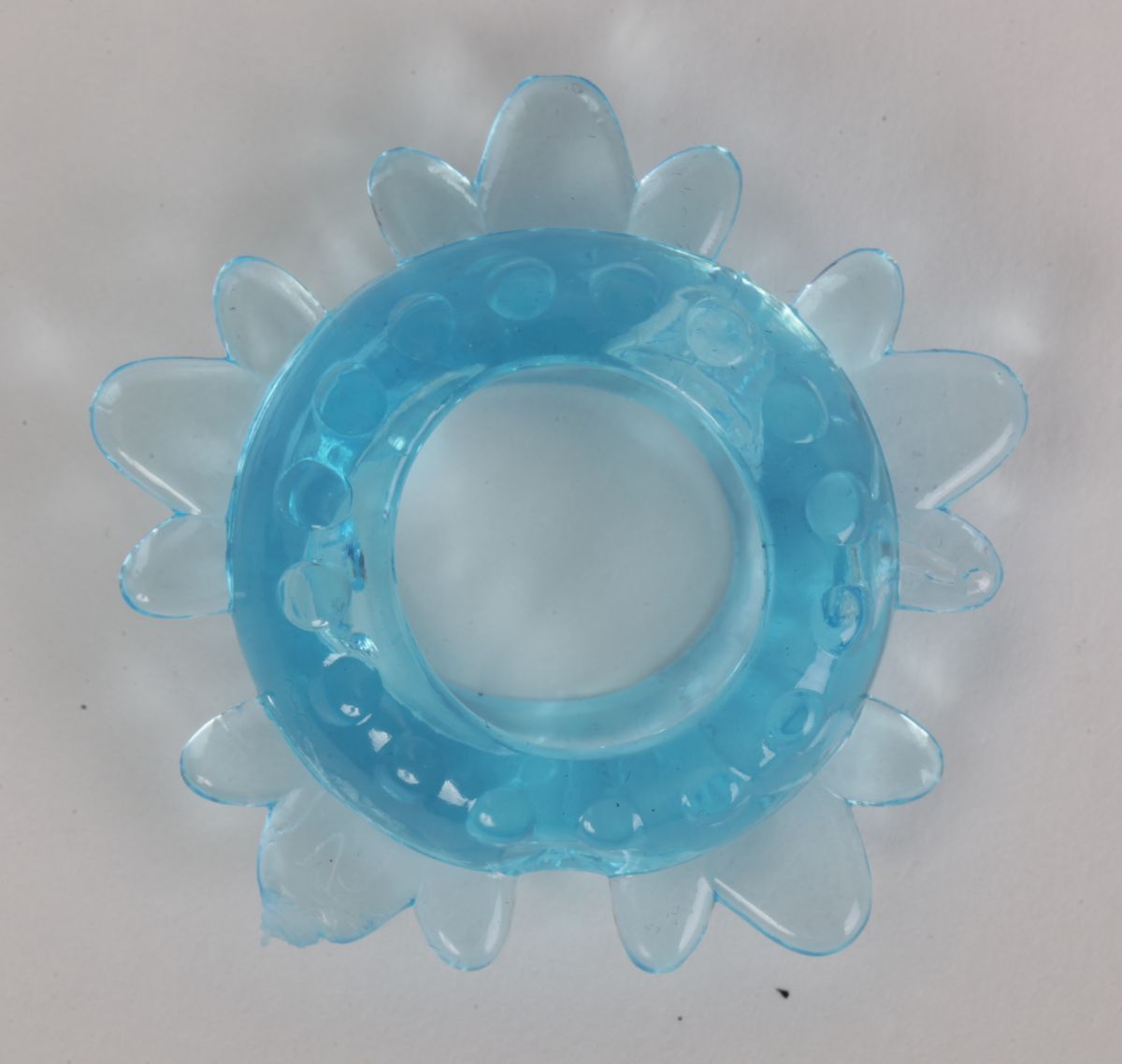 Голубое эрекционное кольцо с мягкими лепестками в виде снежинки. Материал ПВХ. Внутренний диаметр - 1,7 см.