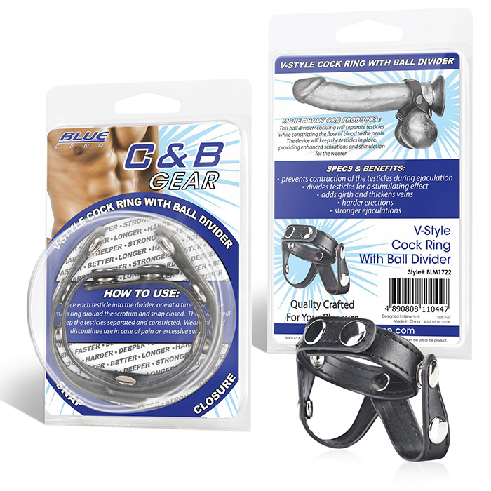 Эрекционное V-образное кольцо из качественной искусственной кожи, зажимающее пенис и мошонку одновременно, а также разделяя яички. Подобное кольцо предотвращает сокращение мошонки во время эякуляции, стимулирует яички, а также пролонгирует эрекцию, добавляет дополнительный объем пенису, утолщая вены, и усиливает оргазм. Диаметр можно варьировать от 4 см до 5 см. Упаковка: Блистер.