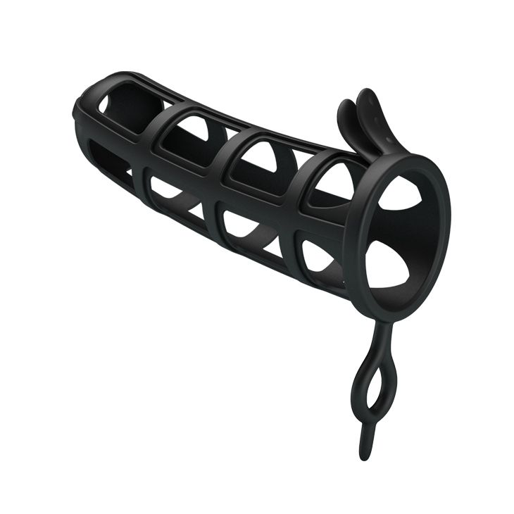 Черная насадка-клетка Penis Sleeve. Очень эластичная. Способствует утолщению члена, покрывает его стимулирующим партнершу рельефом. Внутренний диаметр - 3 см.