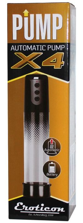 Помпа Eroticon серии X — изделие премиум-сегмента. Помпа X4 управляется одной рукой при помощи кнопочного пульта, расположенного в головке цилиндра. Комплектация: помпа, уплотнительное кольцо, эрекционное кольцо. Внутренняя длина цилиндра - 20 см. Диаметр эрекционного кольца - 1,8 см.