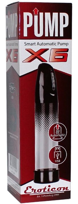 Помпа Eroticon® серии X — изделие премиум-сегмента. Умная помпа X6 запоминает максимально комфортное давление и воспроизводит его при следующем использовании помпы. Литиевый аккумулятор заряжается через USB. В комплекте: уплотнительное кольцо, эрекционное кольцо, кабель для зарядки Внутренняя длина цилиндра - 20 см., минимальный диаметр - 6 см.