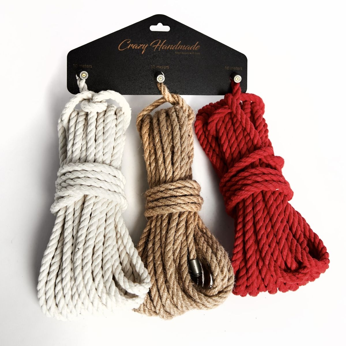 Набор из 3 разноцветных веревок для шибари (белая и красная из хлопка, коричневая из джута).