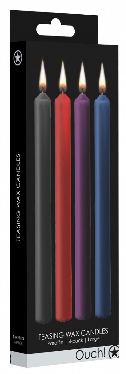 Teasing Wax Candles Large – набор из 4-х разноцветных восковых свечей. Усильте ощущения, увеличьте адреналин, и насладитесь беспрецедентным возбуждением, когда капающий горячий воск будет касаться кожи, не вызывая ожогов. Восковые BDSM-свечи в сочетании с повязкой на глазах или другим приспособлением для бондажа гарантируют увлекательное приключение всем участникам. При первом использовании рекомендуется начать капать с некоторого расстояния. Когда вы с партнером привыкнете к этому ощущению, можно экспериментировать, поднося свечи ближе. Помните, что чем меньше расстояние до кожи, тем горячее воск. В упаковке 4 свечи по 30 гр. каждая.