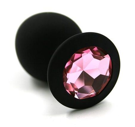 Анальная пробка из силикона черного цвета, размер M. Страз в основании круглой формы, выполнен из стекла светло-розового цвета. Упакована в вельветовый мешочек для хранения. Вес - 46,5 граммов.