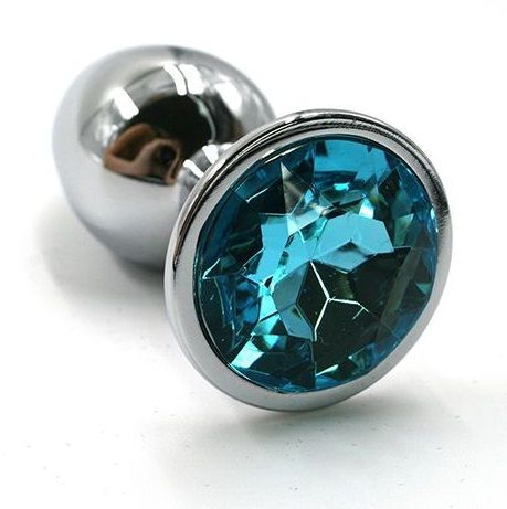 Анальная пробка из алюминия размер S. Страз в основании круглой формы, выполнен из стекла голубого цвета. Упакована в вельветовый мешочек для хранения. Вес - 52 гр.