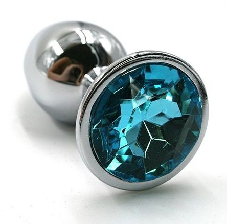 Анальная пробка из алюминия размер M. Страз в основании круглой формы, выполнен из стекла голубого цвета. Упакована в вельветовый мешочек для хранения. Вес - 82,5 гр.
