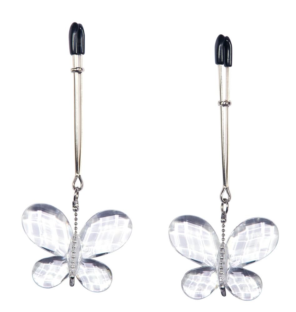 Зажимы для сосков с подвесками-бабочками Butterfly Clamps. Бабочки выполнены из акрила. Рабочая часть зажима покрыта ПВХ.
