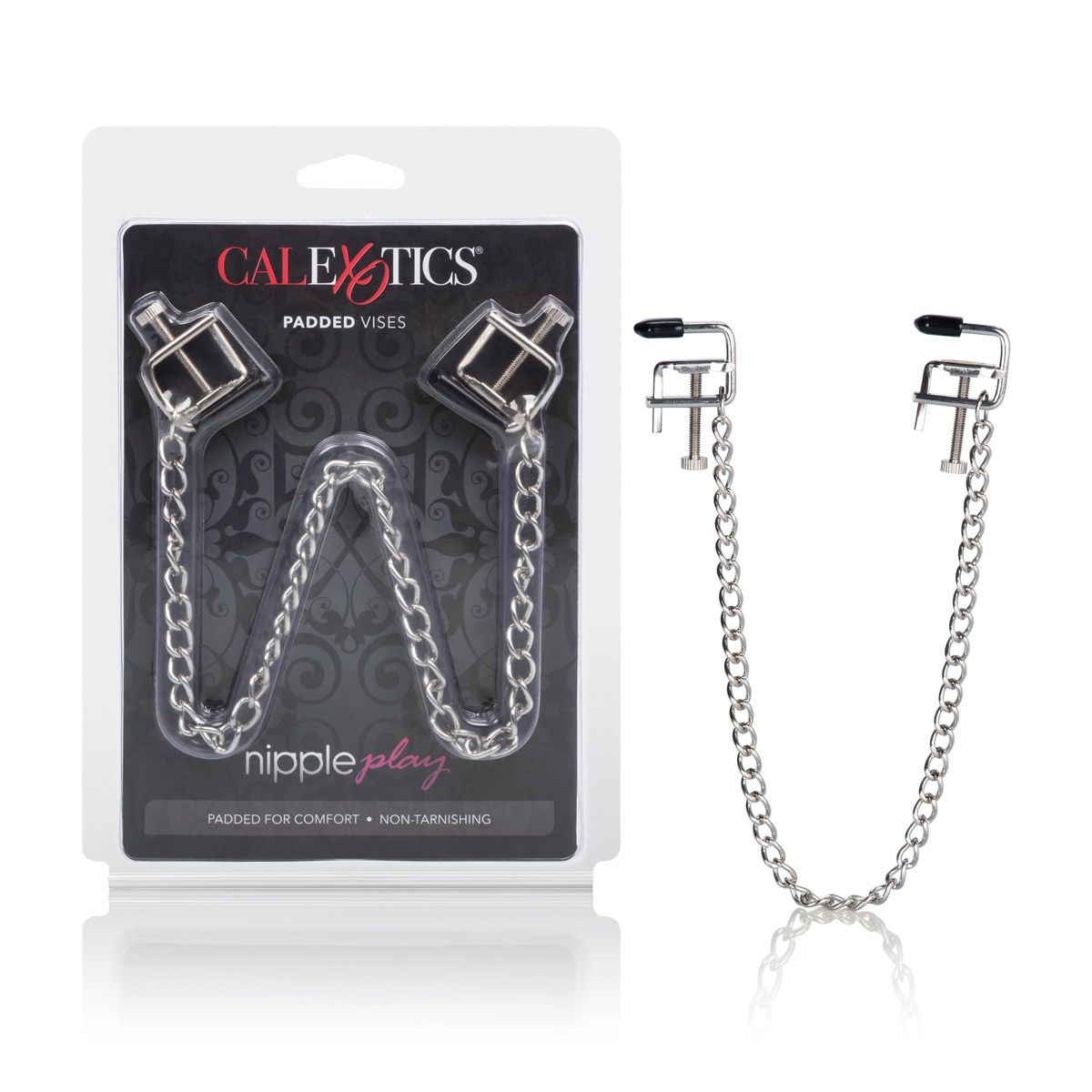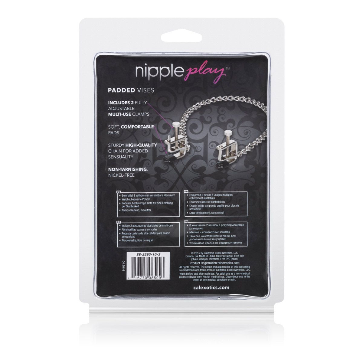 Между собой зажимы Nipple Play Padded Vises соединены металлической цепью, которая одновременно служит своеобразным утяжелителем для дополнительных ощущений во время сексуальных игр. Зажимы имеют мягкие наконечники, а также уникальный дизайн в виде тисков. Размер одного зажима - 2,5 х 3,25 см.