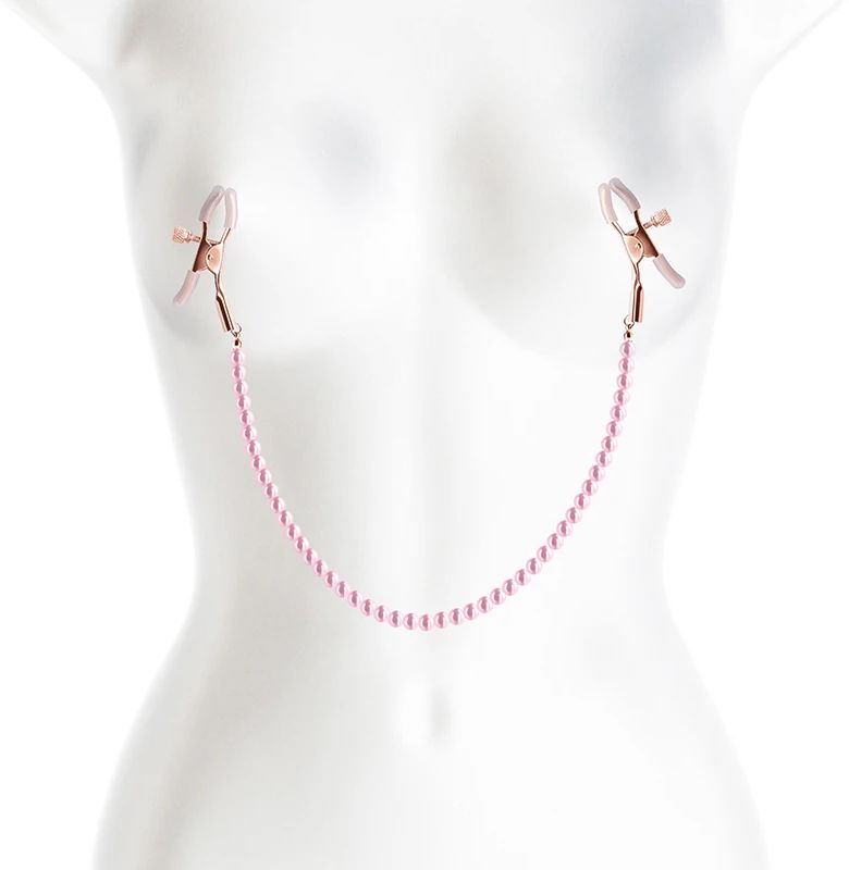 Зажимы на соски с цепочкой из бусин служат дополнительным стимулятором одной из самых чувствительных зон. Включают в себя 2 полностью регулируемых многофункциональных зажима. Имеют мягкие наконечники, между собой зажимы соединены цепью из бусин, которая одновременно служит своеобразным утяжелителем для дополнительных ощущений. Размеры зажима - 6,25х1,25 см.