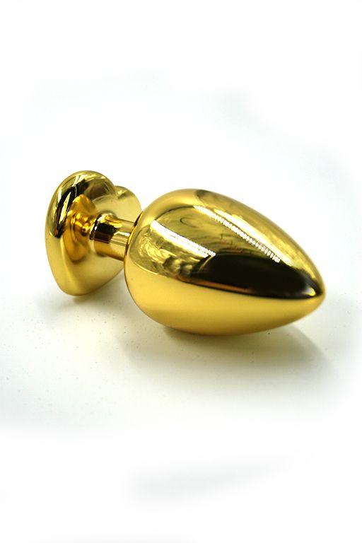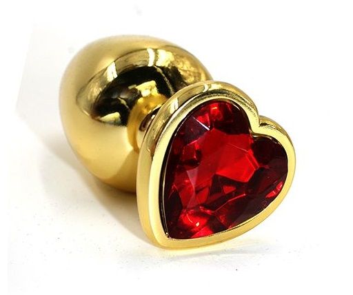 Золотистая анальная пробка из алюминия размер L. Страз в форме сердца, выполнен из стекла красного цвета. Упакована в вельветовый мешочек для хранения. Вес - 165,5 гр.