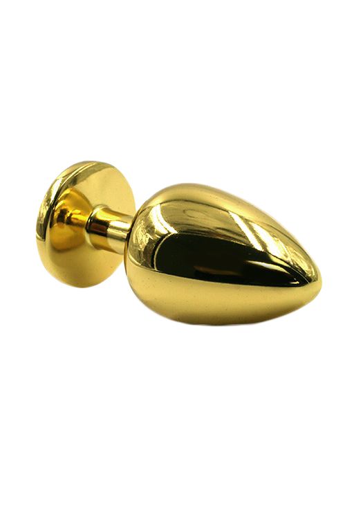 Золотая анальная пробка из алюминия размер S. Страз в основании круглой формы, выполнен из стекла. Упакована в вельветовый мешочек для хранения. Вес - 52 гр.