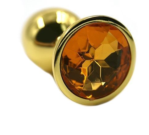 Золотая анальная пробка из алюминия размер S. Страз в основании круглой формы, выполнен из стекла желтого цвета. Упакована в вельветовый мешочек для хранения. Вес - 52 гр.